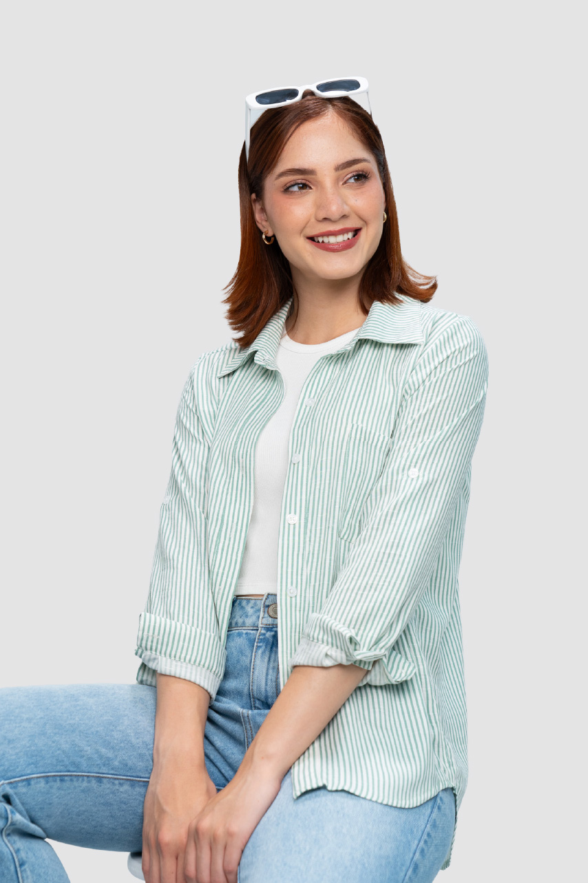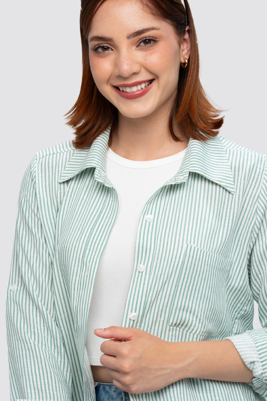 Confeccionada en lino listado, de textura ligera y fresca. Cuenta con bolsillo lateral izquierdo, boton frontal y regulador en mangas para un uso cómodo y versátil.