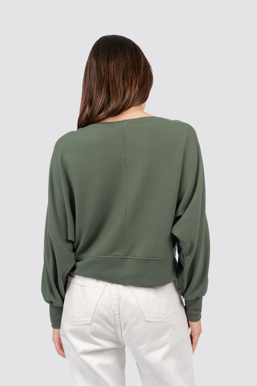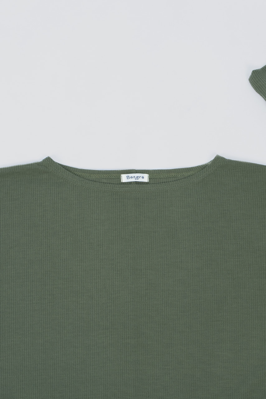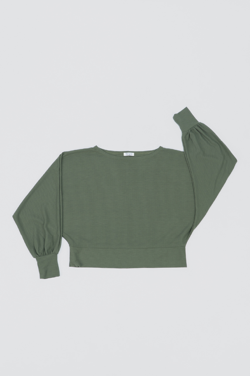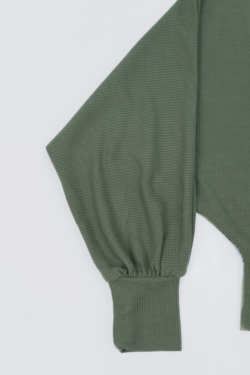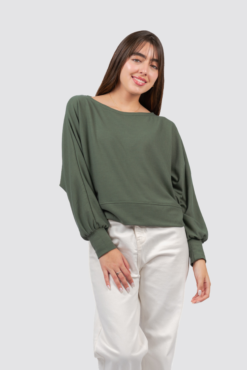 Confeccionado en tela baby waffer, suave, ligera y de agradable textura. Su diseño de manga murciélago, cuello semi bote y pretina en la cintura aportan una caída fluida que estiliza la silueta y brinda comodidad para el uso diario.