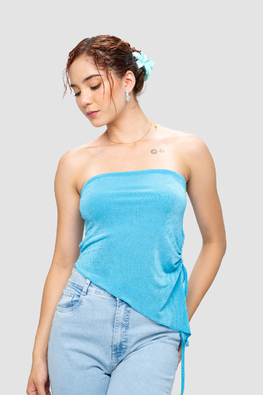 Confeccionado en tela tipo acetato, de tacto suave. Diseño strapless, con detalle regulable lateral que se adapta al cuerpo y aporta movimiento.